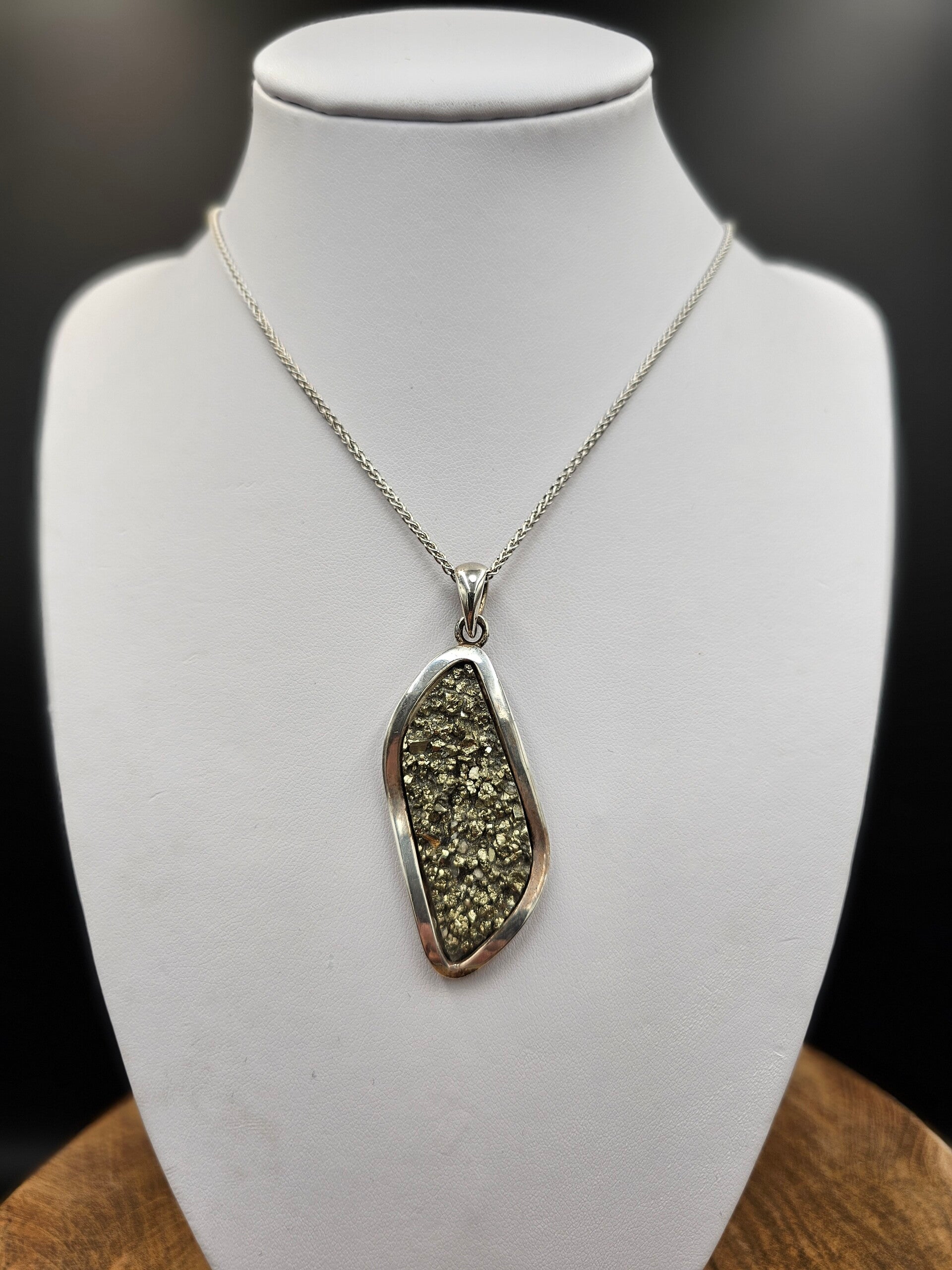 Pyriet hanger, gezet in zilver. Afmeting incl. oogje 59x25mm