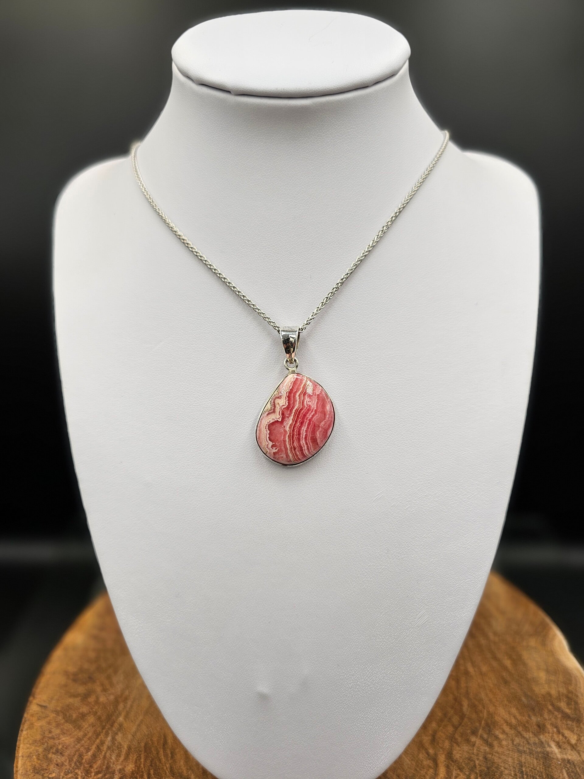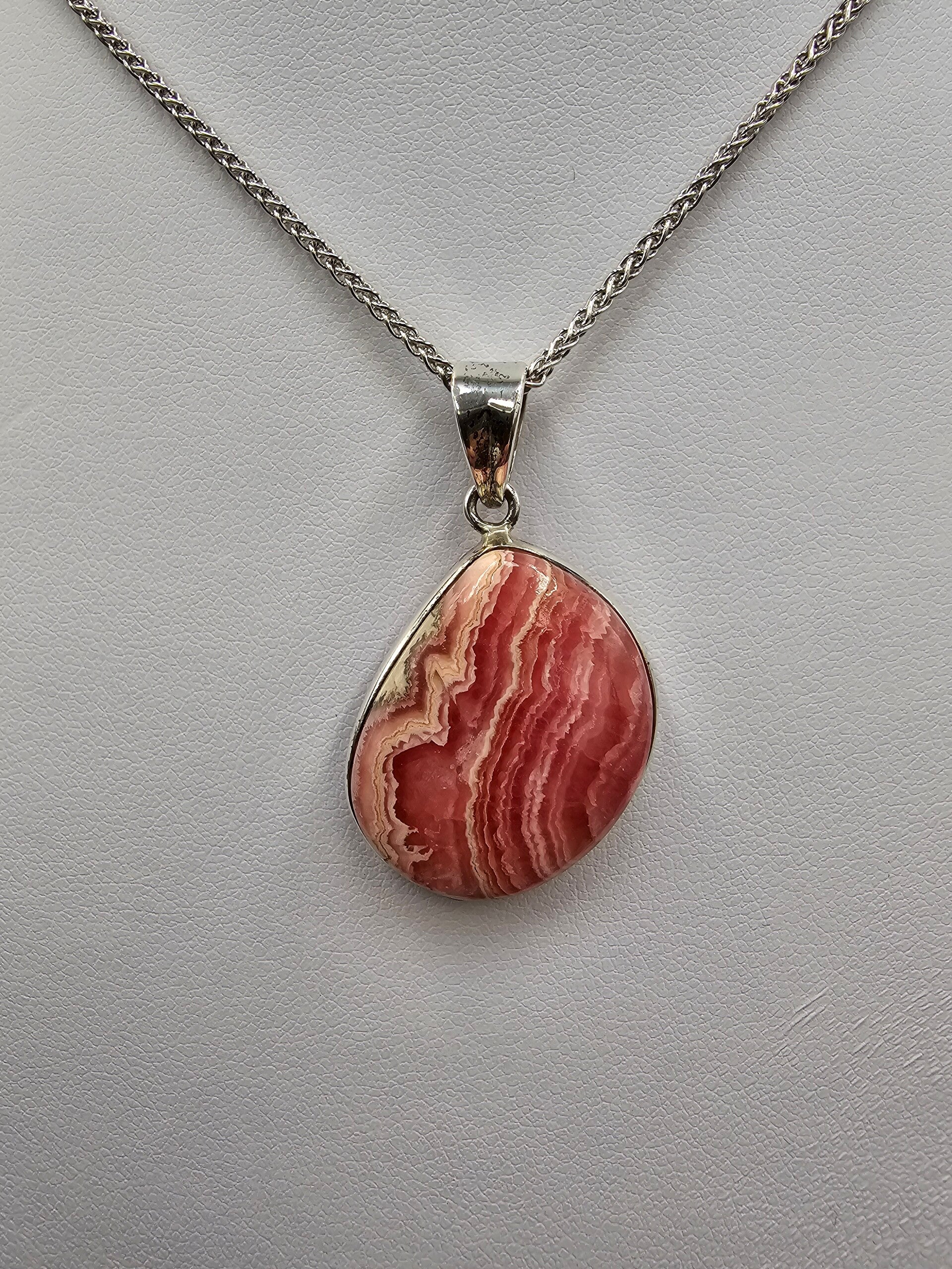 Rhodochrosiet hanger gezet in zilver. Afmeting incl. oogje 38x22mm