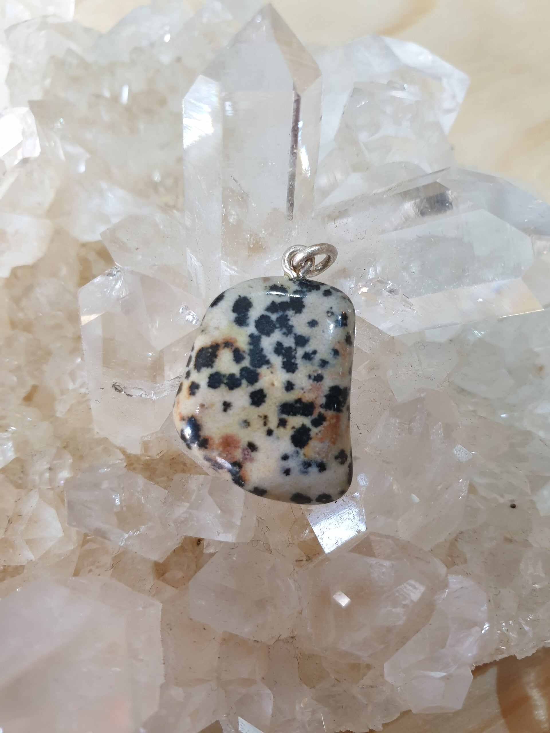 Op de foto ziet u een voorbeeld van een Dalmatiër Jaspis hanger uit ons assortiment, wij zoeken voor u zorgvuldig een mooie vergelijkbare hanger uit!